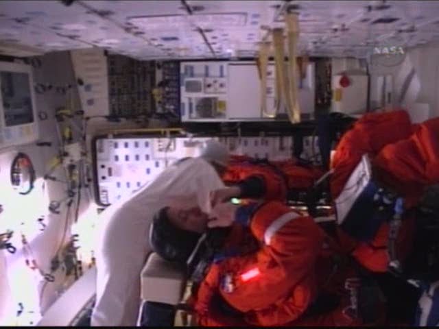 Il veterano John Grunsfeld si sta sistemando nel middeck.