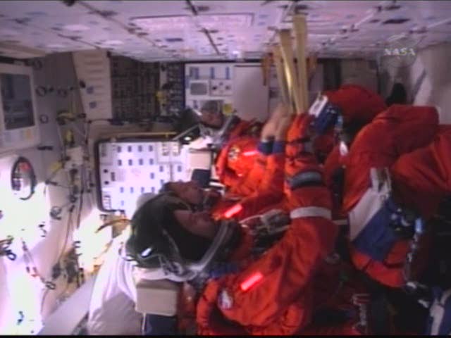 Micheal Massimino è entrato nel Middeck e si sta sistemando nel sedile n° 6 , al centro tra Grunsfeld e Feustel .
