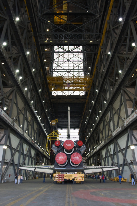 Nel VAB si sta procedendo al fissaggio dell’ Endeavour sullo stack.