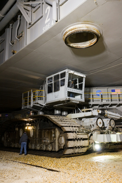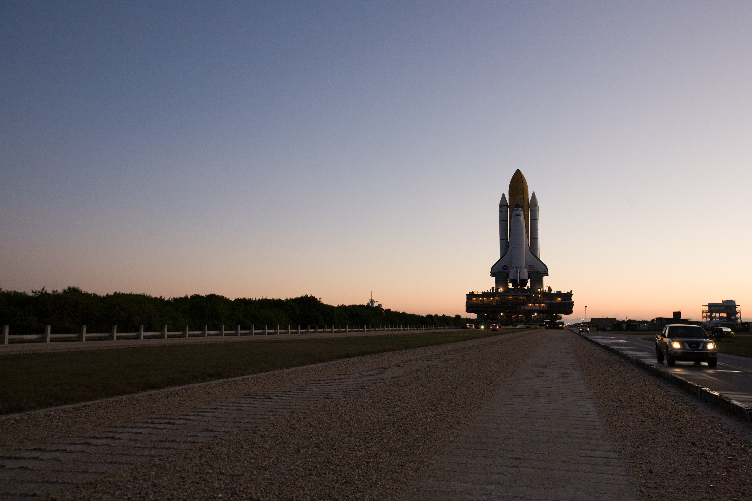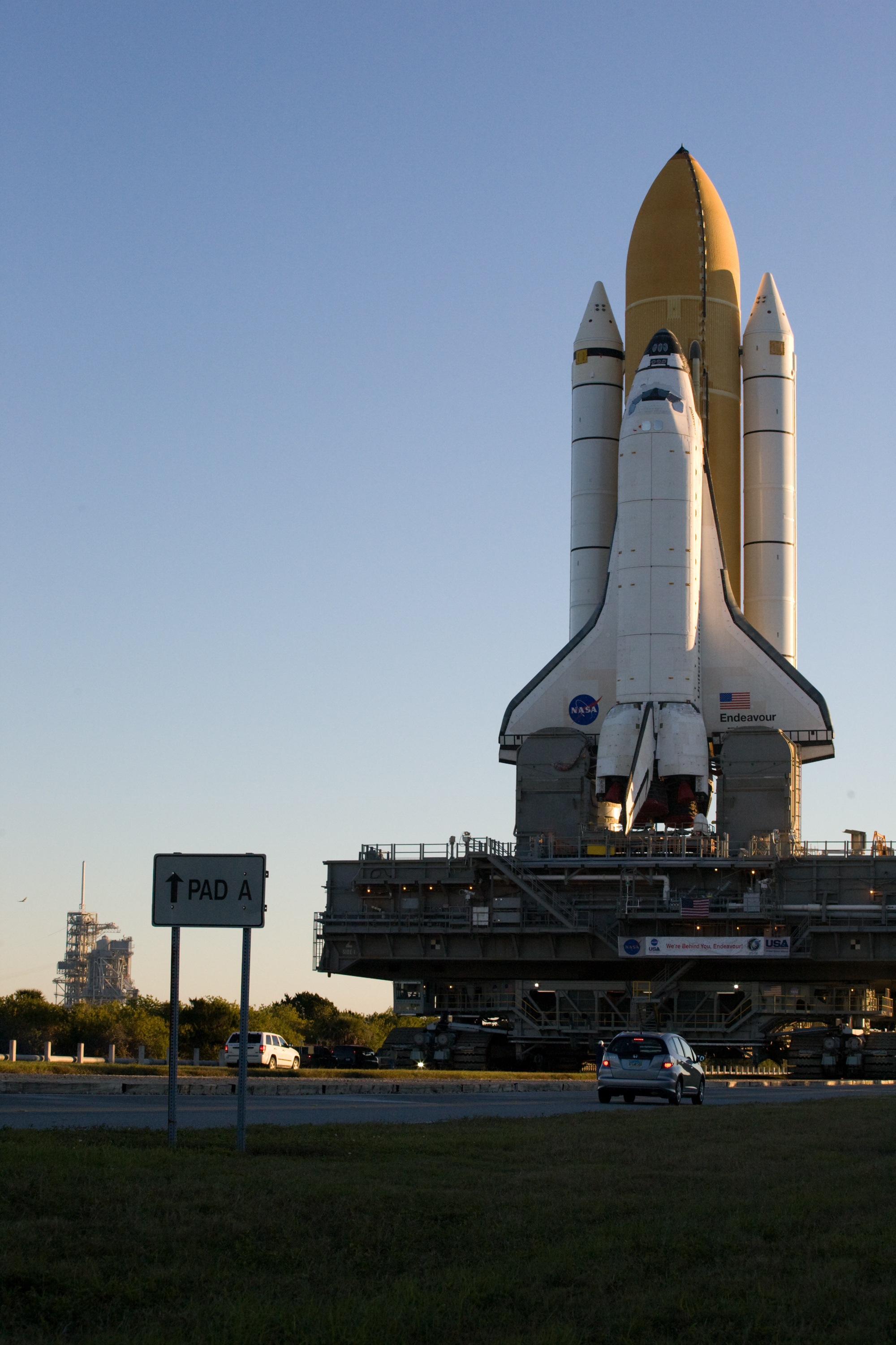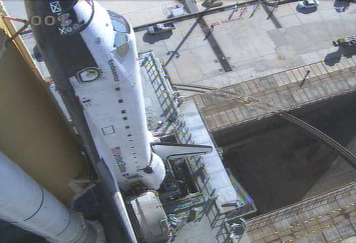 Lo Space Shuttle Endeavour è arrivato al pad 39A. Ora si provvederà a fissare la MLP ai supporti del pad.