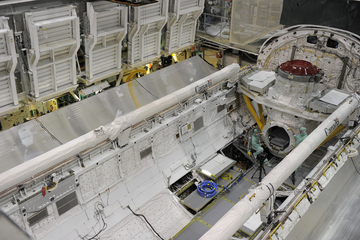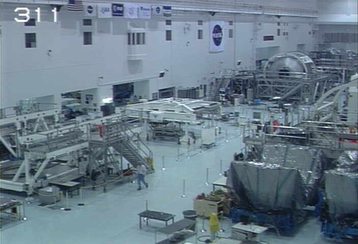 In questo scatto della SSPF, si vede, avvolto con una copertura protettiva, lo Spacelab Pallet (SLP), che verrebbe utilizzato per riportare a terra il PMA-3 con una configurazione simile a quella utilizzata per il trasporto in orbita nel 2000 a bordo di STS-92 (allegato #2).