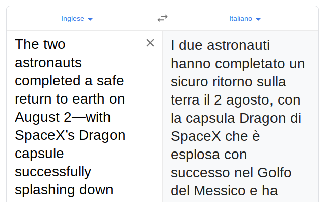 - I due astronauti hanno completato un sicuro ritorno sulla terra il 2 agosto, con la capsula Dragon di SpaceX che è esplosa con successo nel Golfo del Messico e ha concluso un traguardo ragguardevole per Musk, 18 anni dopo aver fondato la compagnia di esplorazione spaziale.