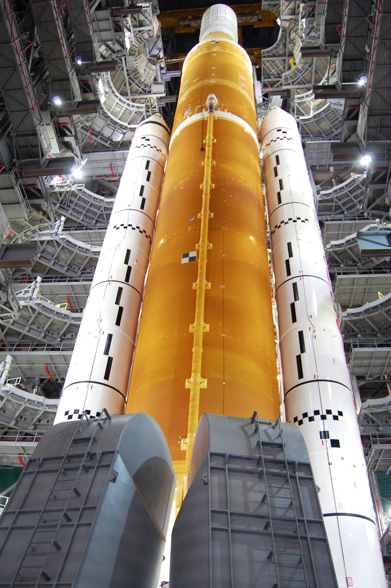 Ritraendo quindi le “braccia” del Mobile Launch Platform, assieme alle piattaforme di lavoro, possiamo ammirare per la prima volta SLS nella sua interezza senza ostruzioni. Sono scatti davvero mozzafiato… manca solo Orion ormai.