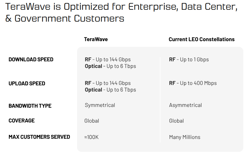 The TeraWave architecture consists of 5,408 optically interconnected satellites in low Earth orbit (LEO) and medium Earth orbit (MEO). This multi-orbit design enables ultra-high-throughput links between global hubs and distributed, multigigabit user connections, particularly in remote, rural, and suburban areas where diverse fiber paths are costly, technically infeasible, or slow to deploy.