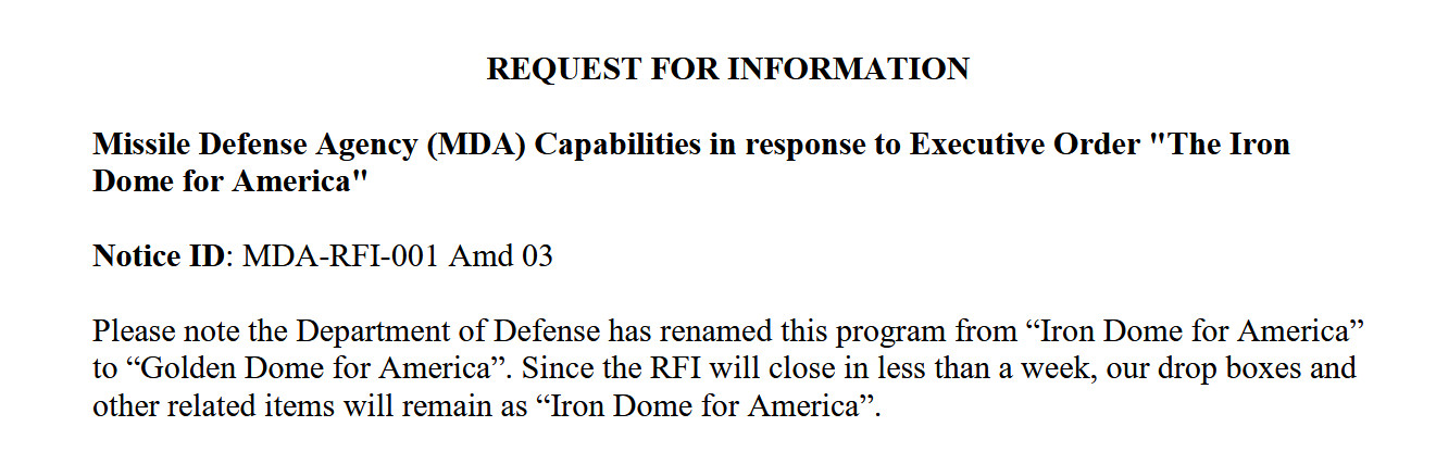 A fine gennaio Trump ha firmato un ordine esecutivo dal titolo “The Iron Dome for America” che impegna il ministro della difesa a preparare entro 60 giorni un piano per lo sviluppo di uno “scudo” antimissile di nuova generazione.