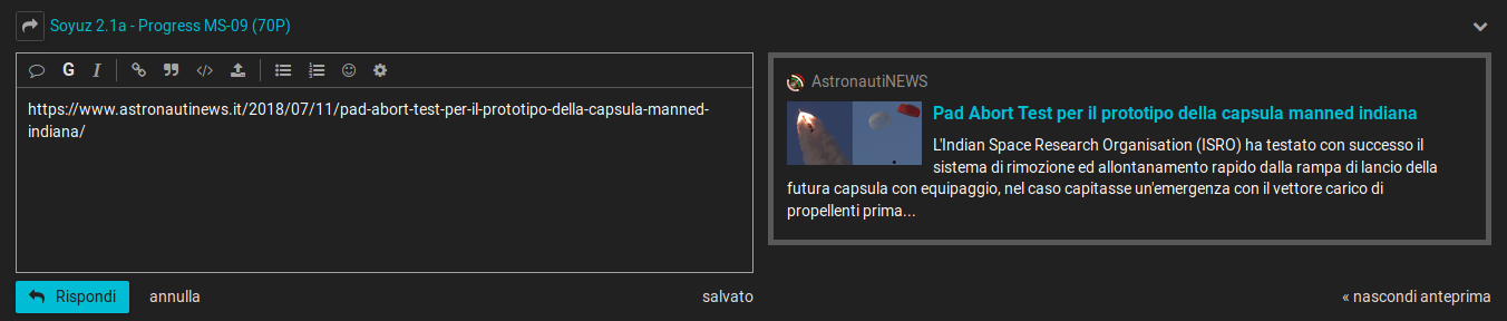 Premi uno qualunque dei pulsanti “Rispondi” per aprire il pannello dell’editor nella parte bassa del tuo Browser. Puoi rispondere ad uno specifico messaggio premendo il rispettivo pulsante “Rispondi”, oppure aggiungere un messaggio in coda alla discussione tramite il pulsante “Rispondi” presente in fondo alla lista dei messaggi. Puoi continuare a leggere (e anche navigare in altri Argomenti) mentre scrivi la tua risposta. Minimizza pure l’editor se hai bisogno di più spazio. Le bozze vengono automaticamente salvate mentre scrivi.