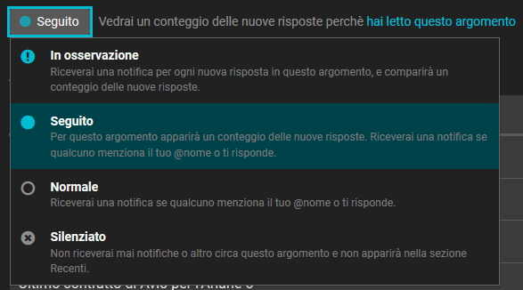 Ogni Argomento cui hai partecipato attivamente (creandolo, rispondendo o leggendolo per un periodo prolungato) sarà automaticamente seguito, e mostrerà un indicatore con il numero di messaggi non letti. Puoi cambiare i livelli di notifica relativi ad ogni singolo Argomento tramite il pulsante di controllo delle notifiche posizionato in fondo ad ogni Argomento. Le preferenze di notifica possono essere impostate anche per categoria. Per cambiare i valori preimpostati, vai nella pagina Preferenze del tuo utente.