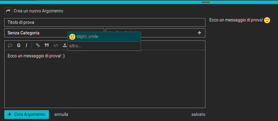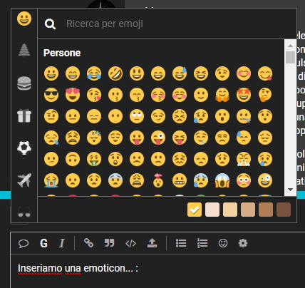 Per usare gli Emoji standard devi digitare : per cercarne uno per nome, oppure puoi usare i tradizionali “smileys” come ![]()