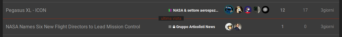 Gli Argomenti al di sopra della linea rossa sono nuovi o sono stati aggiornati dalla tua ultima visita. Quando una discussione è stata letta completamente, questa apparirà nell’indice in colore grigio, invece che nero (o bianco, a seconda del tema prescelto).