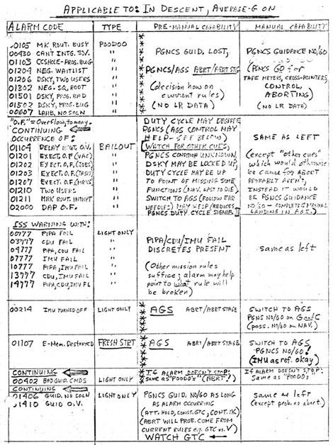 E’ da questo foglio che fu dedotta l’ “innocuità” degli allarmi 1202 e 1201 rilevati durante l’allunaggio: erano dovuti a un eccesso di cautela, che aveva portato gli astronauti a tenere acceso anche il radar di rendez-vous (utile solo per riagganciarsi al CSM) durante la discesa, oltre al radar di atterraggio. E il computer di bordo non riusci’ a gestire tutto. Cosi’ invio’ quei due WARNING, perche’ di Warning si trattava, in realtà, non di errori! Ma all’epoca evidentemente questa sottile distinzione non era ancora stata adottata…