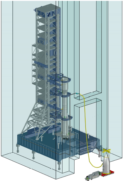 Il lavoro procede su diversi fronti. Al Kennedy Space Center, sono già iniziati da oltre una settimana i lavori per issare la torre di servizio che servirà per i lanci sia della versione intermedia che la versione pesante di OmegA. La torre sarà di dimensioni ragguardevoli, di poco più bassa delle torri destinate a SLS. Nella High Bay 2 procedono le esercitazioni di manovra dei booster solidi tramite l’utilizzo di “pathfinders”.