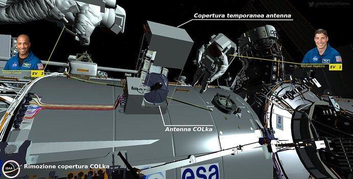 Nel caso particolare di questa EVA poi (e questa è una prima assoluta) ci sarà anche una partecipazione molto attiva del Columbus Flight Director, il quale riporterà ad ISS Flight gli inputs coordinati dei team Europei (incluso anche gli ingegneri di Airbus ed MDA, che hanno costruito Bartolomeo e Col-Ka).