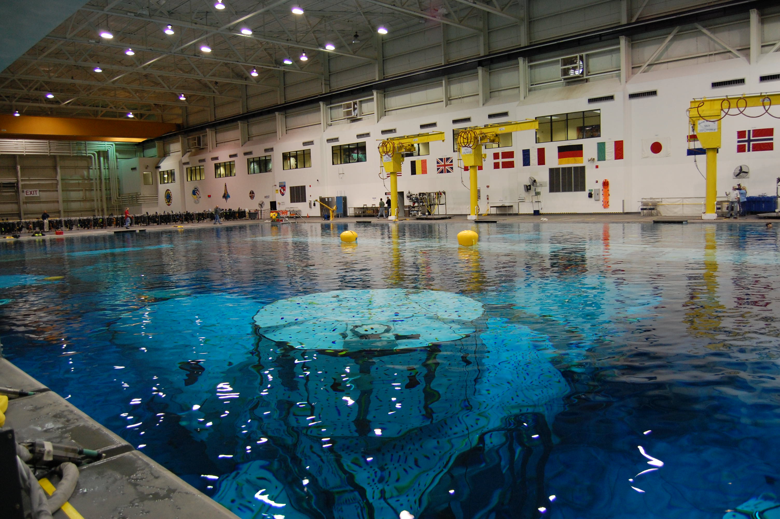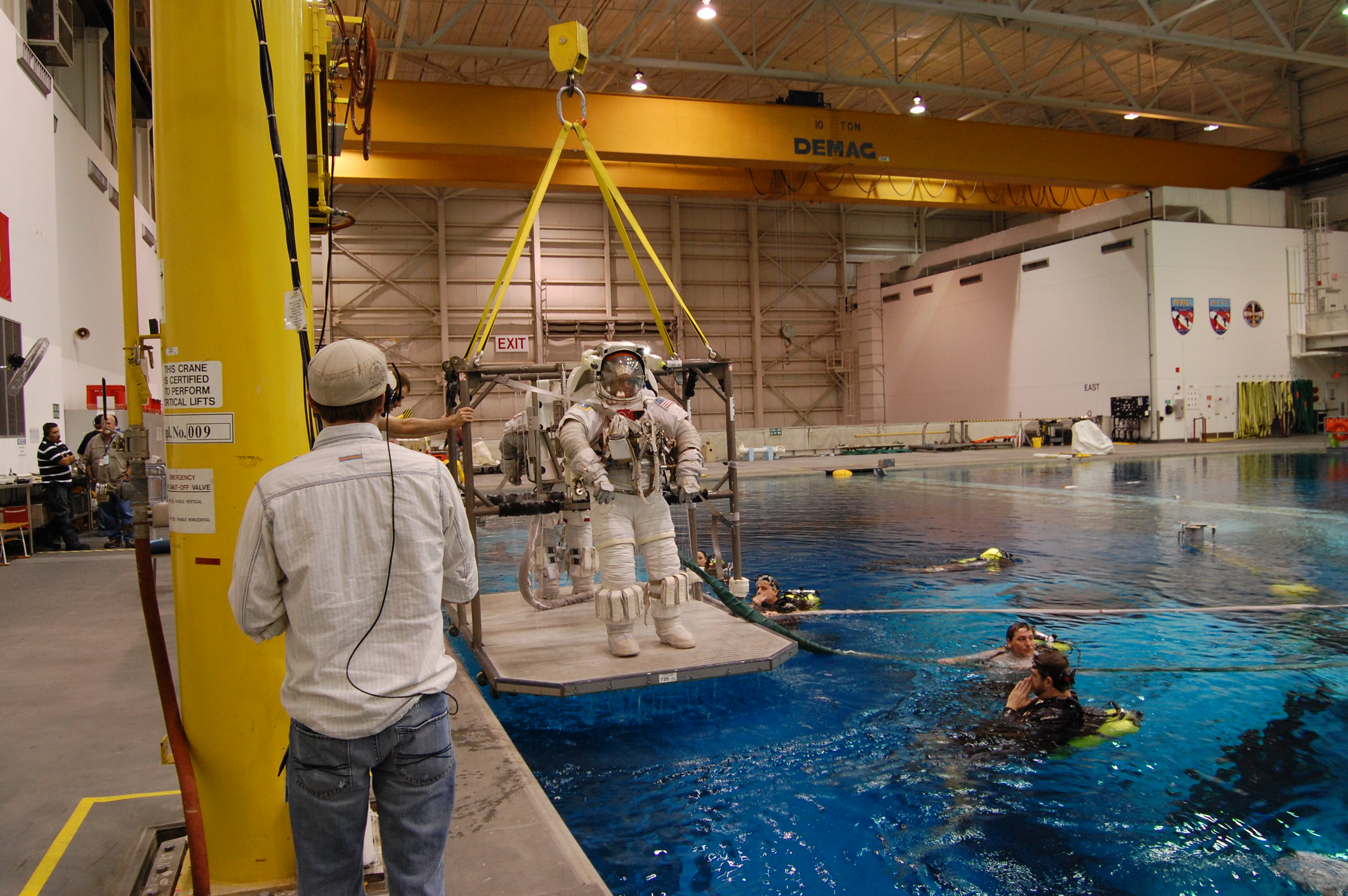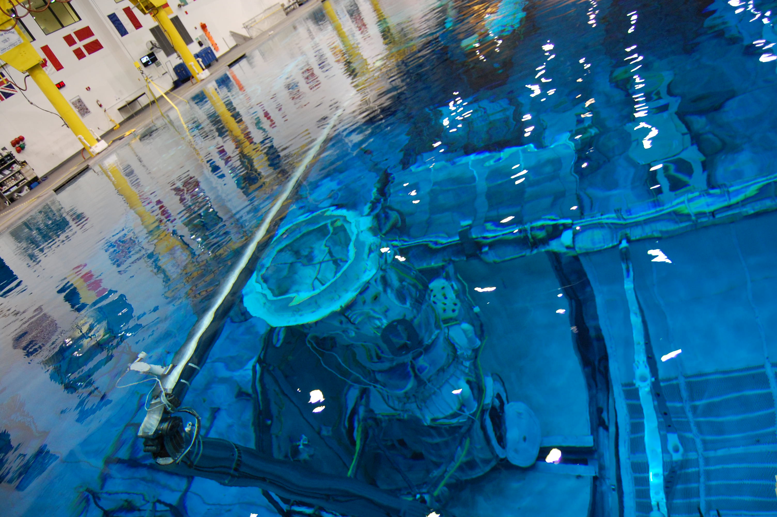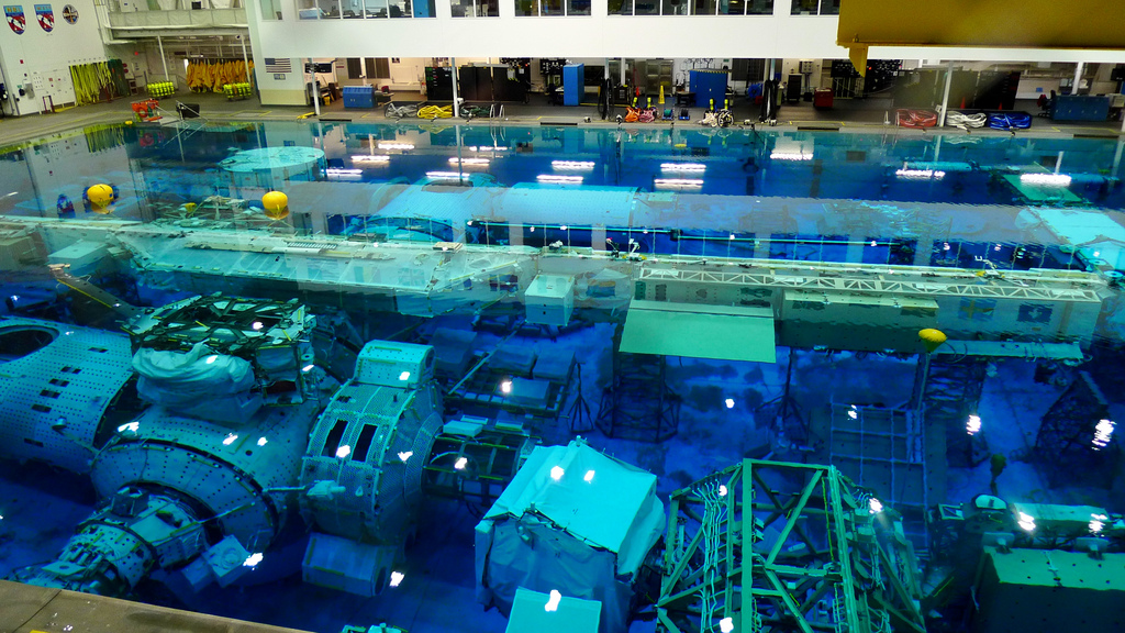 In alto a destra si nota un altro pezzo di truss. Siccome non ci stava tutto in piscina, lo hanno montato ruotato di 90 gradi, e quando devono fare training per un EVA che arriva fino a laggiù, gli astronauti vanno fino alla fine del truss montato sulla stazione, poi i sub li prendono e li trasportano sul pezzo più estremo, che é staccato, e da lí continuano il training.