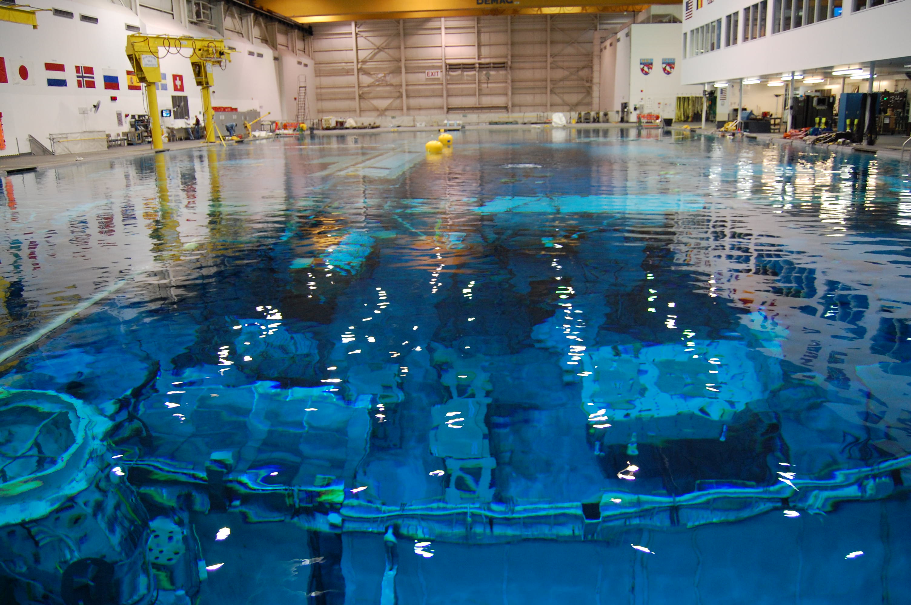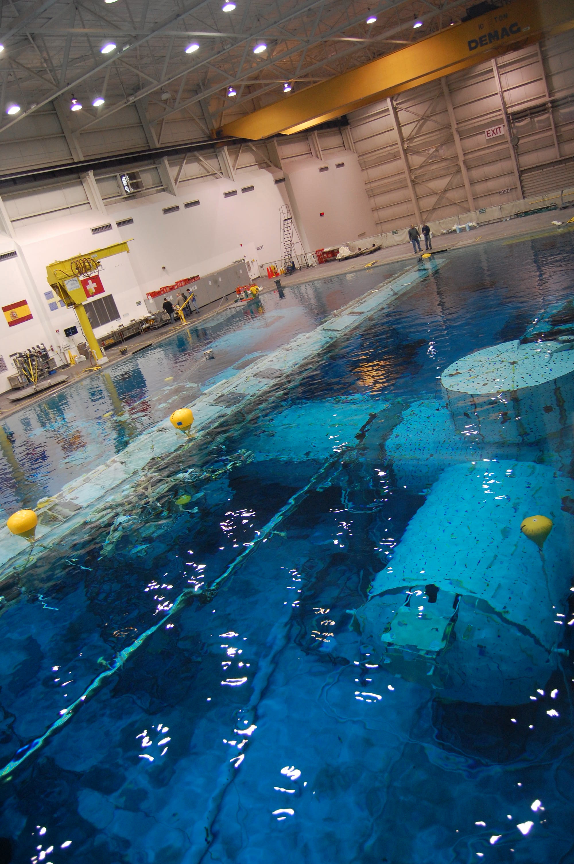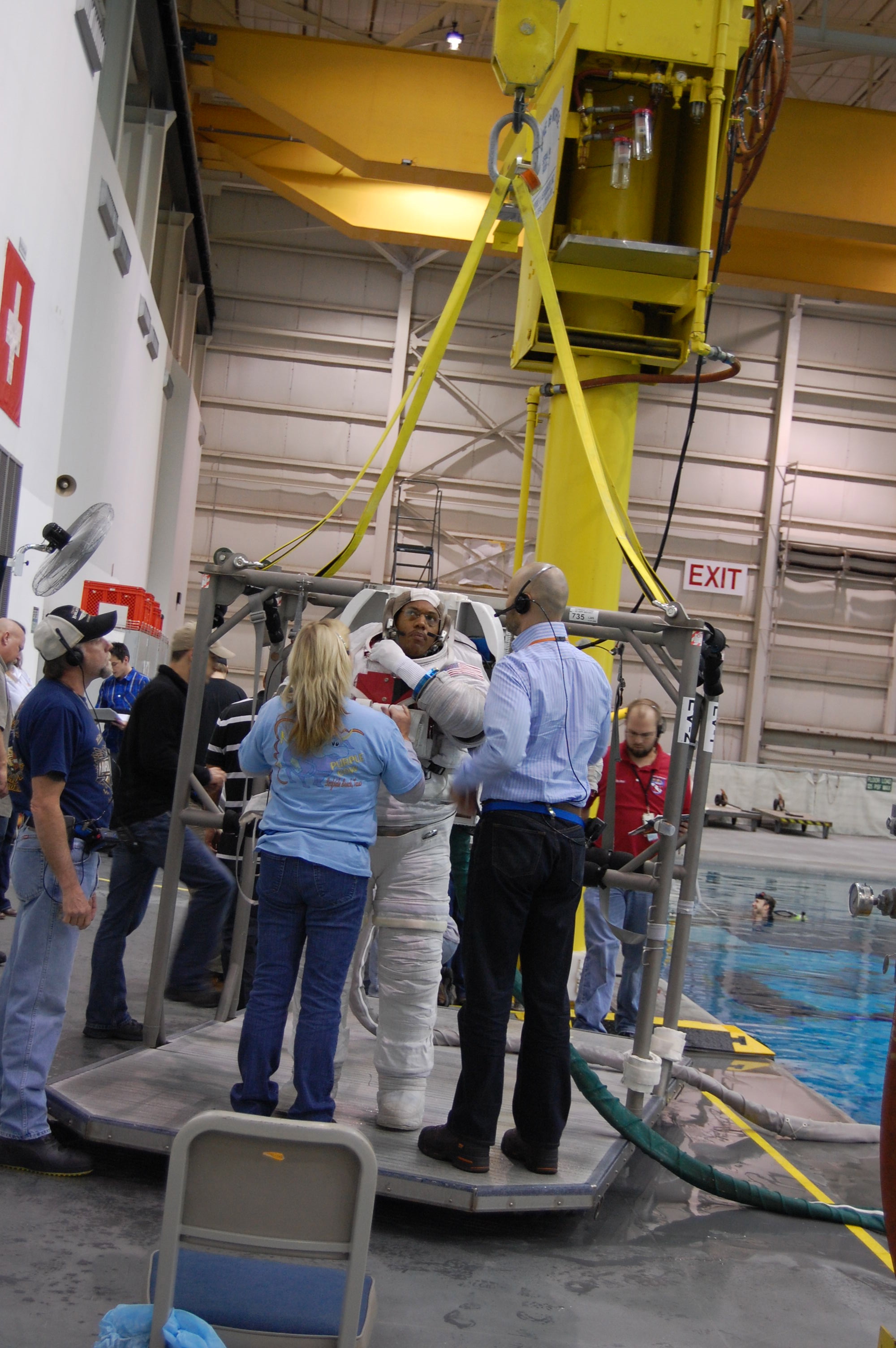In alto a destra si nota un altro pezzo di truss. Siccome non ci stava tutto in piscina, lo hanno montato ruotato di 90 gradi, e quando devono fare training per un EVA che arriva fino a laggiù, gli astronauti vanno fino alla fine del truss montato sulla stazione, poi i sub li prendono e li trasportano sul pezzo più estremo, che é staccato, e da lí continuano il training.