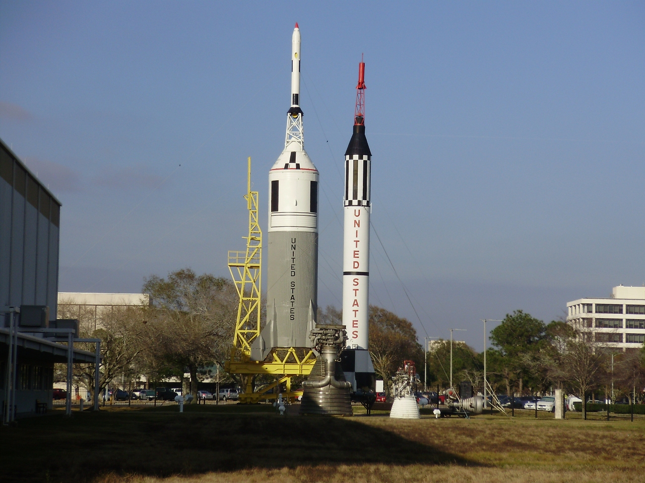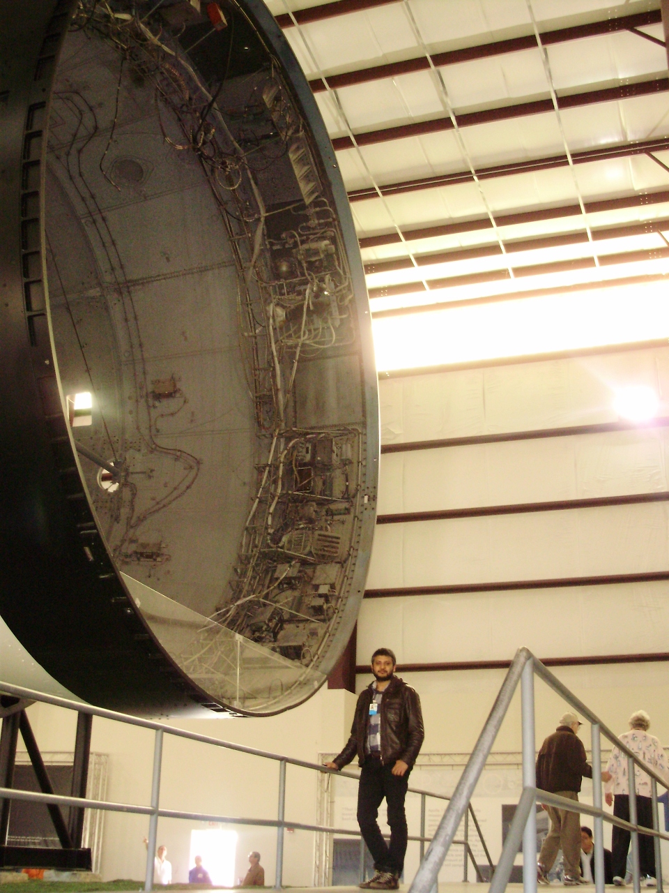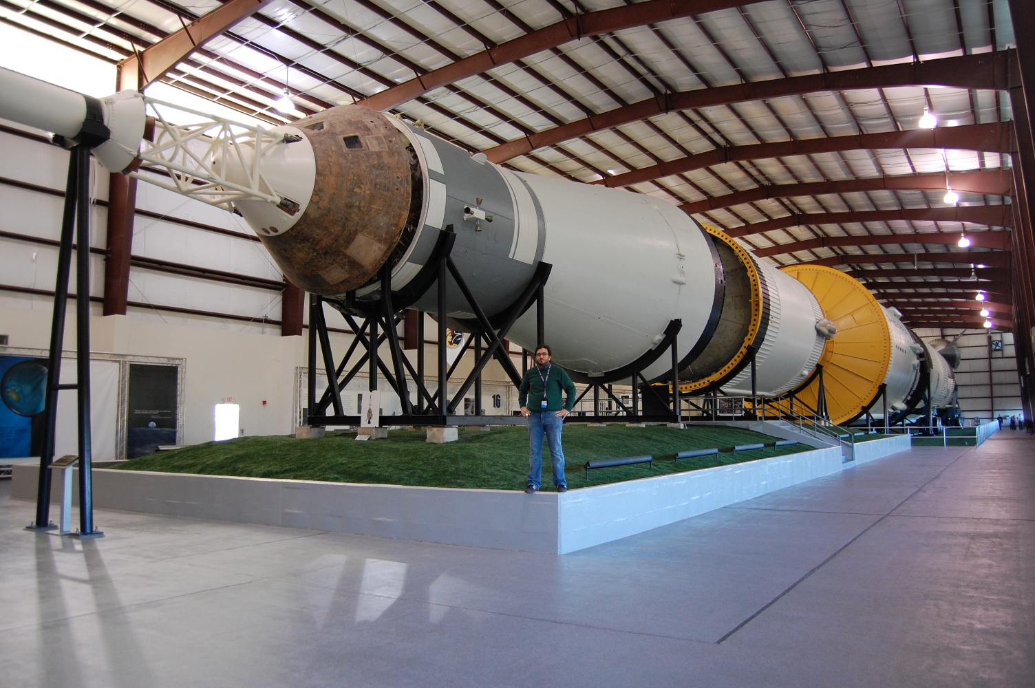 - Io in fronte al Redstone. Quello alla mia sinistra è il motore del primo stadio del Saturn V, giusto per dare un’idea di quanto era immenso…