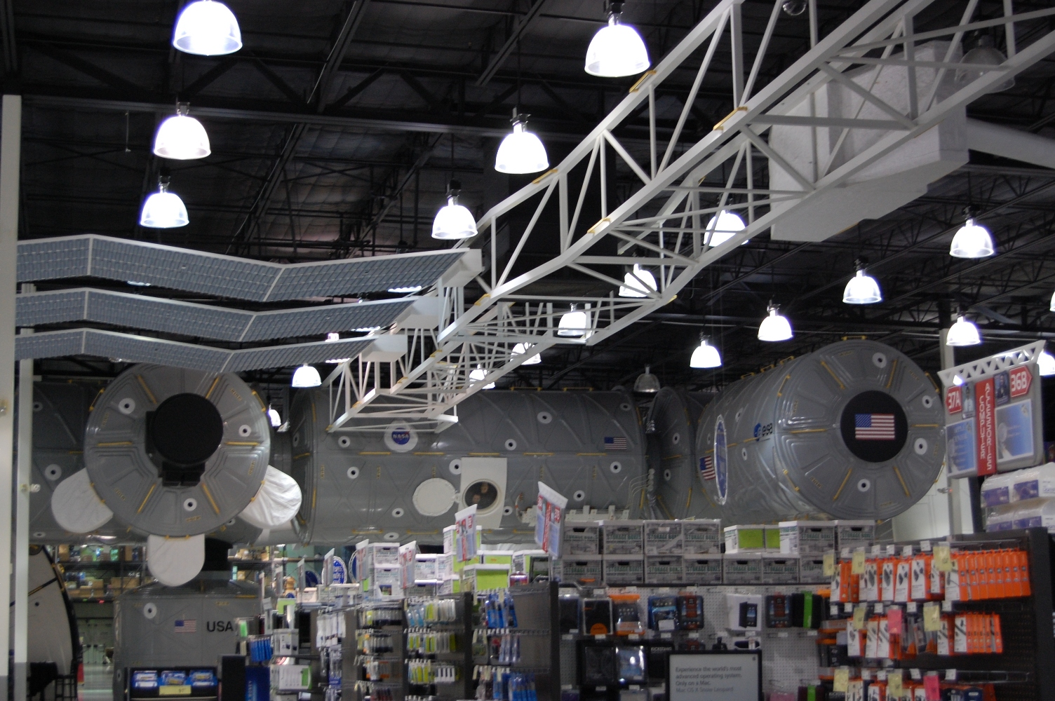 In sostanza è un mega negozio di elettronica e simili, tipo Saturn o Media World. Piccola particolarità è che è a forma di moduli spaziali, e al suo interno, appesa al soffitto, c’é una ISS in scala 1:1!